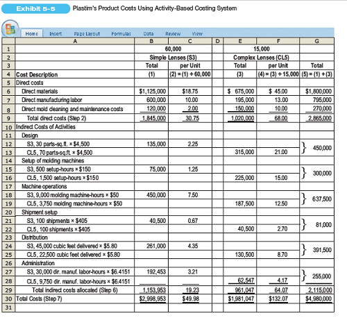Step 7: Compute the Total Cost of the Products by Adding All Direct and Indirect Costs Assigned to the Products. Exhibit 5-5 presents the product costs for the simple and complex lenses. The direct costs are calculated in Step 2, and the indirect costs are calculated in Step 6. The ABC system overview in Exhibit 5-3 shows three direct-cost categories and six indirect-cost categories. The budgeted cost of each lens type in Exhibit 5-5 has nine line items, three for direct costs and six for indirect costs. The differences between the ABC product costs of S3 and CL5 calculated in Exhibit 5-5 highlight how each of these products uses different amounts of direct and indirect costs in each activity area. We emphasize two features of ABC systems. First, these systems identify all costs used by products, whether the costs are variable or fixed in the short run. When making long-run strategic decisions using ABC information, managers want revenues to exceed total costs. Second, recognizing the hierarchy of costs is critical when allocating costs to products. It is easiest to use the cost hierarchy to first calculate the total costs of each product. The per-unit costs can then be derived by dividing total costs by the number of units produced.
